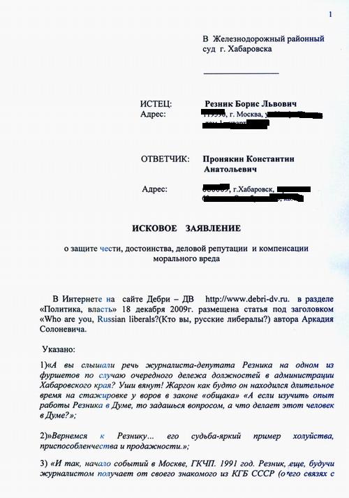 1) Признать не соответствующими действительности, порочащими мои честь, достоинство, доброе имя и деловую репутацию, а так же содержащие обвинение в нарушении мной действующего законодательства сведения, распространенные в Интернете на сайте Дебри — ДВ в разделе «Политика, власть» 18 декабря 2009г. в под заголовком «Who are you, russian liberals? (Кто вы, русские либералы?) автора Аркадия