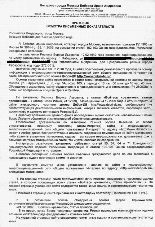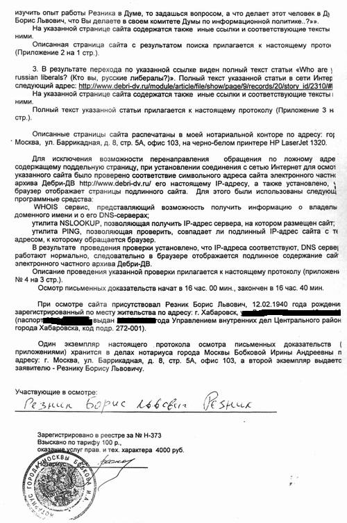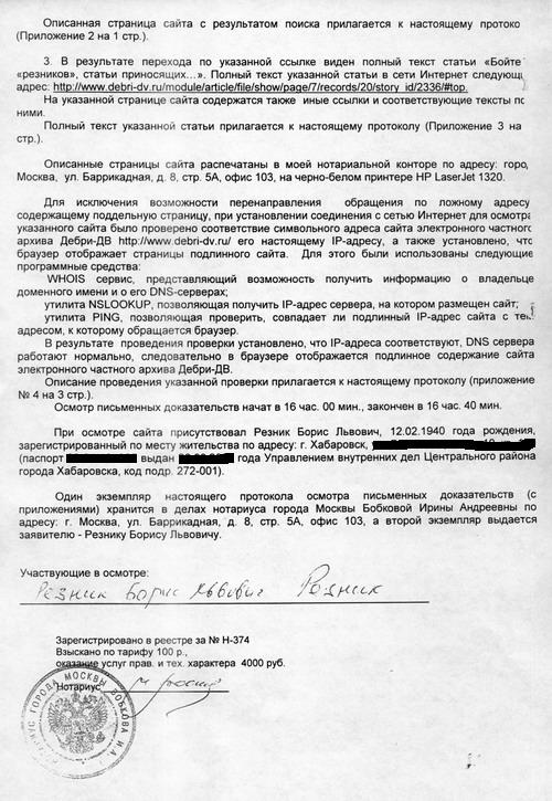 Факт распространения не соответствующих действительности порочащих сведений подтверждается прилагаемыми к исковому заявлению нотариально удостоверенными протоколами осмотров письменных доказательств — информаций в информационно-телекоммуникационной сети общего пользования Интернет на сайте Дебри — ДВ .