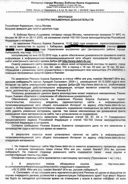 В Интернете на сайте Дебри — ДВ . в разделе «Политика, власть» 18 декабря 2009г. размещена статья под заголовком «Who are you, russian liberals? (Кто вы, русские либералы?), автора Аркадия Солоневича, сведения в которой в отношении Резника Бориса Львовича, а именно: