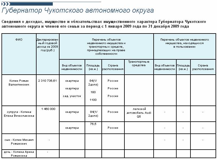 Сведения о доходах и имуществе обнародовал в минувшую среду глава Чукотского автономного округа Роман Копин, который руководит регионом с июля 2008 года (он сменил на этом посту Романа Абрамовича, который теперь занимает место спикера чукотского парламента). Как сообщается на официальном сайте губернатора, в 2009 году доход господина Копина составил 2,31 млн руб.
