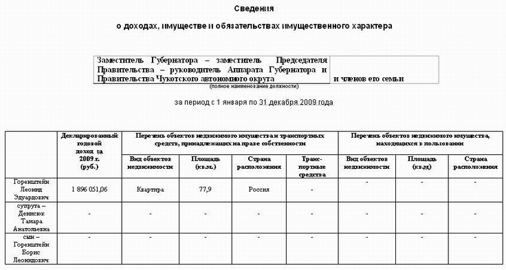 Сведения о доходах, имуществе и обязательствах имущественного характера заместителя Губернатора, заместителя Председателя Правительства, руководителя Аппарата Губернатора и Правительства Чукотского автономного округа Горенштейна Л.Э. и членов его семьи, за период с 1 января по 31 декабря 2009 года