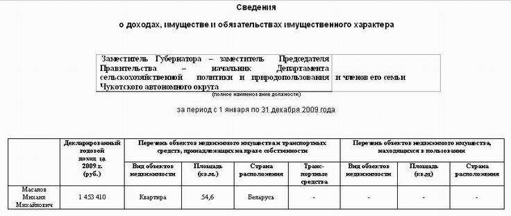 Сведения о доходах, имуществе и обязательствах имущественного характера заместителя Губернатора, заместителя Председателя Правительства, начальника Департамента сельскохозяйственной политики и природопользования Чукотского автономного округа Масалова М.М. и членов его семьи, за период с 1 января по 31 декабря 2009 года.