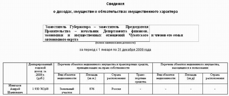 Сведения о доходах, имуществе и обязательствах имущественного характера заместителя Губернатора, заместителя Председателя Правительства, начальника Департамента финансов, экономики и имущественных отношений Чукотского автономного округа Мингазова А.Ш. и членов его семьи, за период с 1 января по 31 декабря 2009 года.