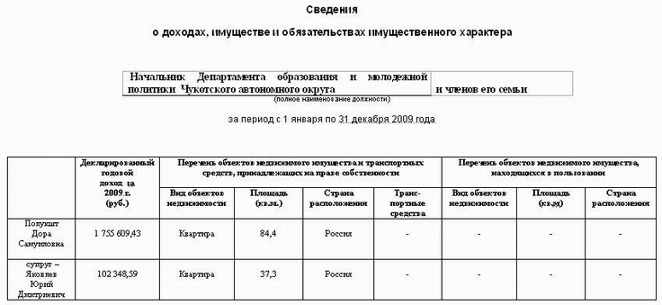Сведения о доходах, имуществе и обязательствах имущественного характера начальника Департамента образования и молодежной политики Чукотского автономного округа Полукшт Д.С. и членов её семьи за период с 1 января по 31 декабря 2009 года.