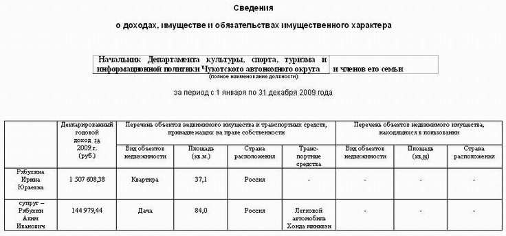 Сведения о доходах, имуществе и обязательствах имущественного характера начальника Департамента культуры, спорта, туризма и информационной политики Чукотского автономного округа Рябухиной И.Ю. и членов её семьи за период с 1 января по 31 декабря 2009 года.