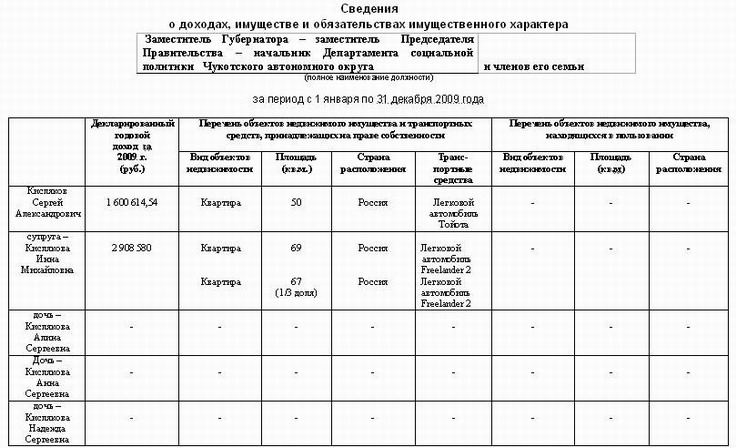 Сведения о доходах, имуществе и обязательствах имущественного характера заместителя Губернатора, заместителя Председателя Правительства, начальника Департамента социальной политики Чукотского автономного округа Кислякова С.А. и членов его семьи, за период с 1 января по 31 декабря 2009 года.