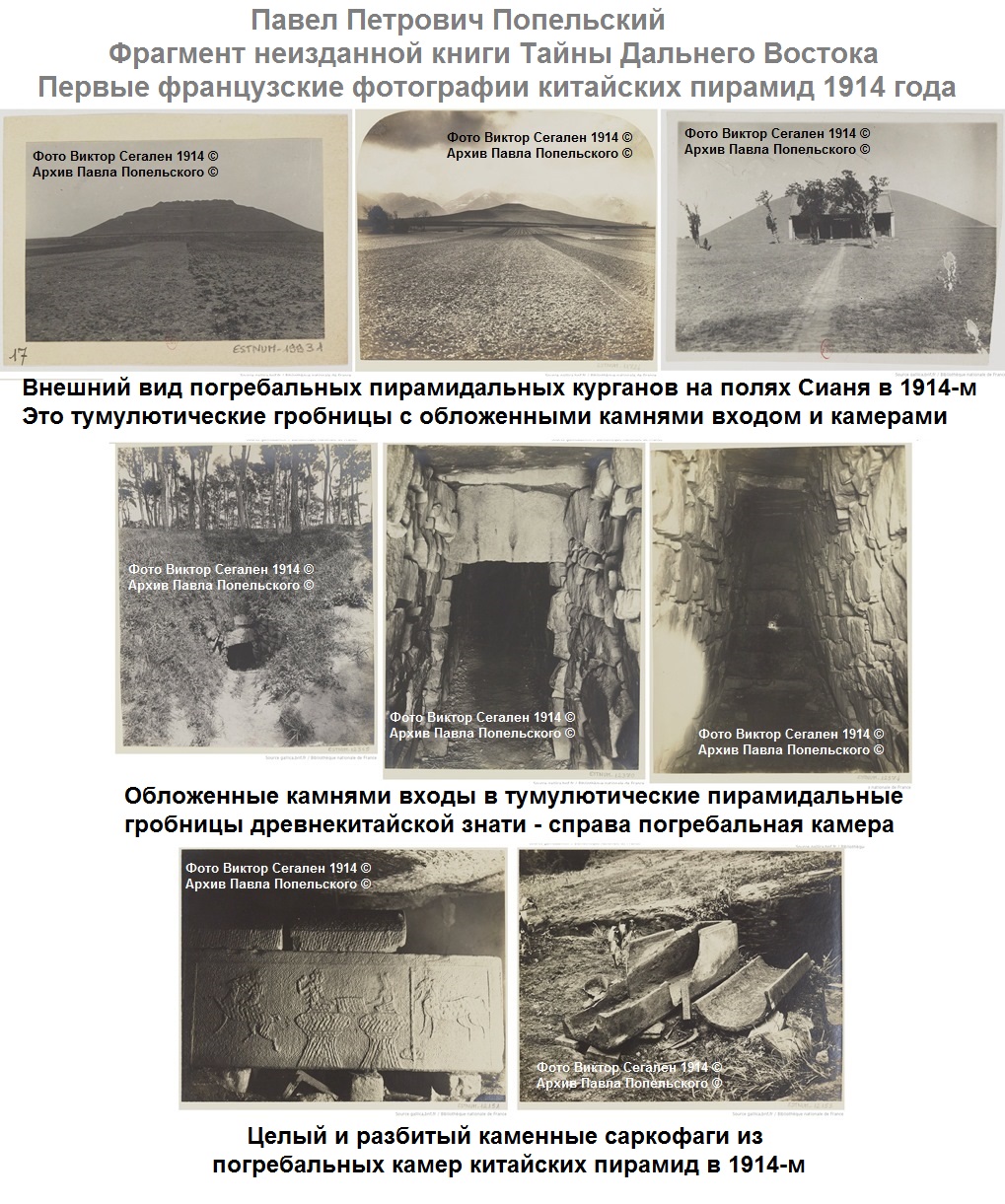 Сегален правильно пишет: Tumulus – Chine. Все известные тогда и сейчас китайские пирамиды - Сиань, Цзиань и тангутские разных династий - это коридорные обложенные камнем гробницы, тумулюсы, сверху засыпанные пирамидальными земляными или каменными курганами. То же самое есть в Японии, в Корее, в нашем Приморье, в Амурской области и даже на реке Анюй Хабаровского края, а также в Европе.
