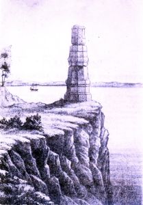Далее в ста пятидесяти саженях от этих памятников, на узком мысу, отвесно спустившемуся к реке, стоит восьмиугольная колонна, несколько похожая на второй памятник. Колонна эта также состоит из трех частей, довольно резко отличающихся друг от друга. Верхняя часть изображает собой как бы урну; но письмен на ней никаких нет».