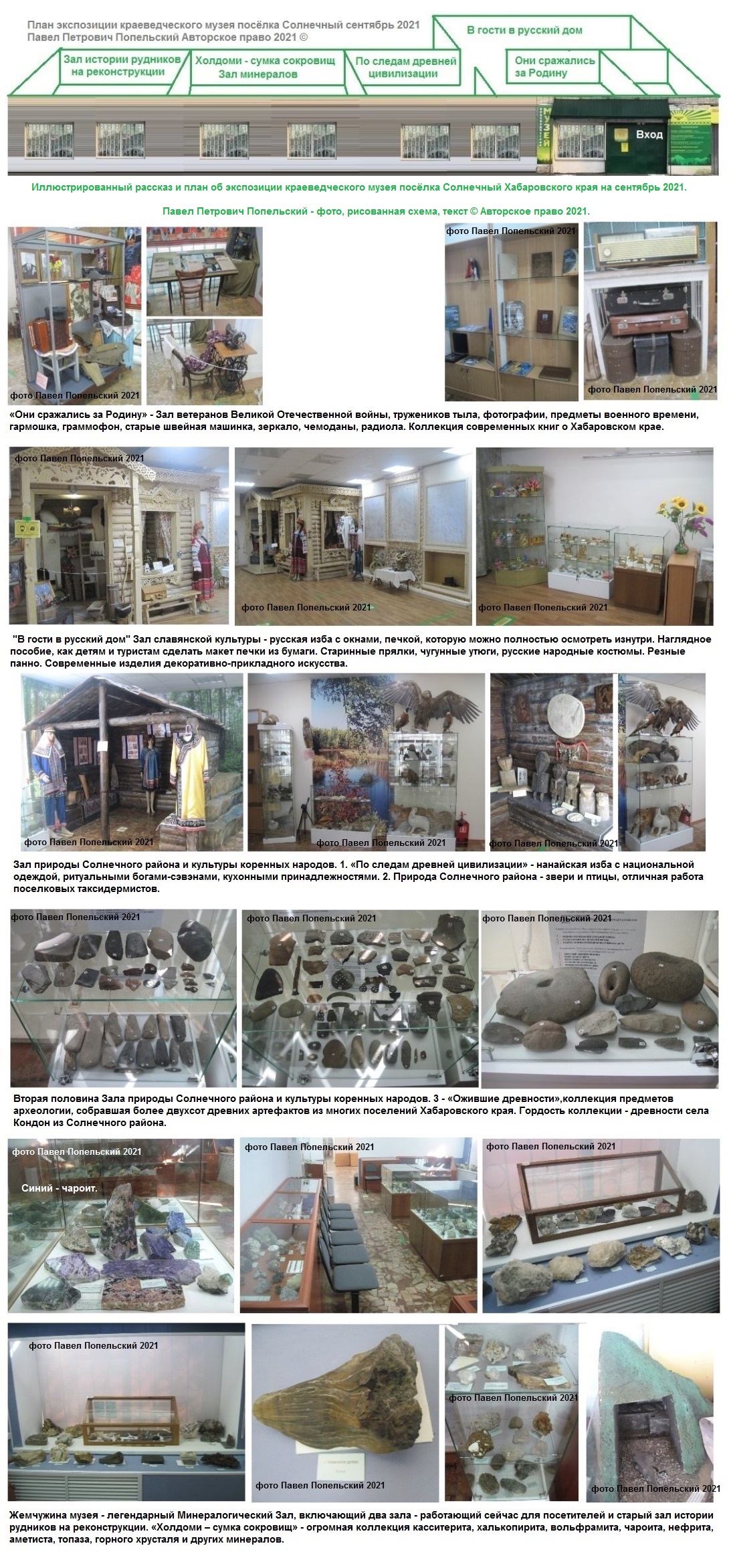 15 сентября 2021 я посетил лучший музей к северу от Комсомольска, историко-минералогический краеведческий музей поселка Солнечный. Сотрудники музея замечательно и тепло приняли меня, показали залы и экспозицию, рассказали о музее. Я прислал им мои публикации и о музее, и о Солнечном районе, о старых рудниках в хабаровских газетах. Этот фотоочерк - новейший путеводитель на сентябрь 2021 по залам музея, схема музея и планы музея открыть обновленный зал после реконструкции. Я сердечно благодарю музей посёлка Солнечный за замечательный приём.