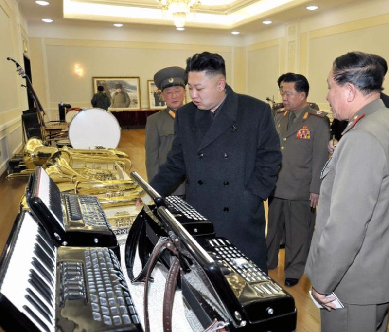 | Ким Чен Ын ознакомляется с музыкальными инструментами для воинов. Март 2013 г. |