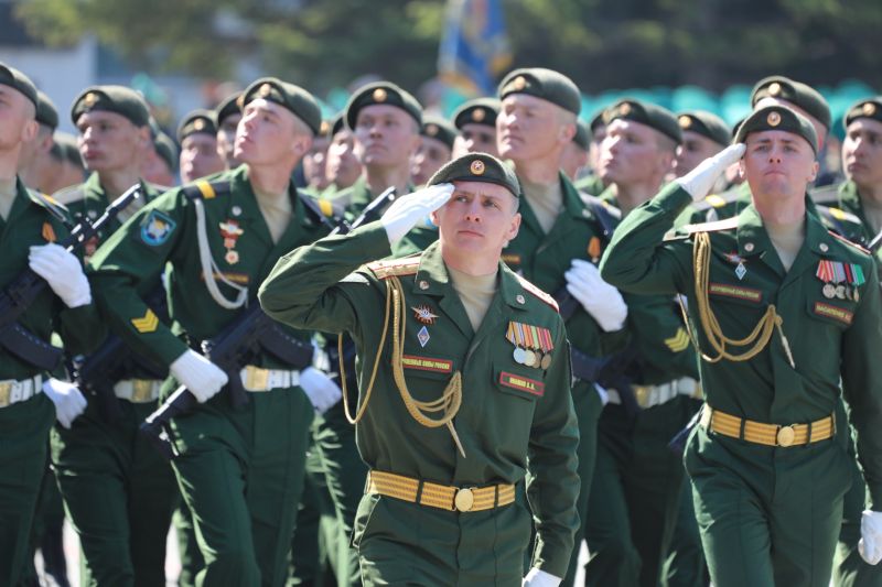 Торжественное прохождение войск Хабаровского гарнизона продолжили, сводные парадные расчёты: отдельного соединения прикрытия, гвардейской мотострелковой бригады, отдельной гвардейской Краснознаменной ордена Красной звезды инженерной бригады.