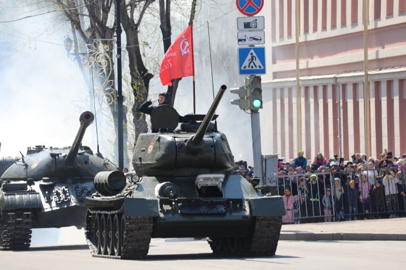 В составе колонны техники времён Великой Отечественной войны в параде войск Хабаровского гарнизона приняли участие: легендарные танки Т-34, ИС-3, самоходная артиллерийская установка ИСУ-152 «Зверобой» и реактивные миномёты БМ-13 «Катюша».