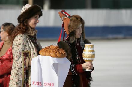 Все духовенство якутской епархии собралось в VIP-зале аэропорта «Туймаада». Спустя какое-то время туда подтянулись и вновь прибывшие. Подвезли два свежеиспеченных каравая, три рушника и несколько солонок, из которых надлежало выбрать по одному экземпляру. Отбирали всем миром. Отобранный румяный каравай с утвержденной солонкой водрузили на одобренный всеми рушник…