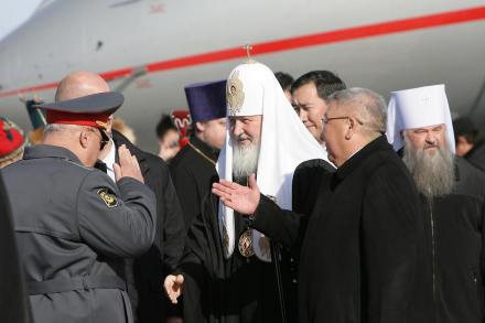 В 10.40 совершил посадку спецборт, на котором прибыла делегация, сопровождающая патриарха. Это высокое духовенство – настоятели храмов, монастырей, а также журналистский пул патриарха и мужской хор Сретенского монастыря Москвы.