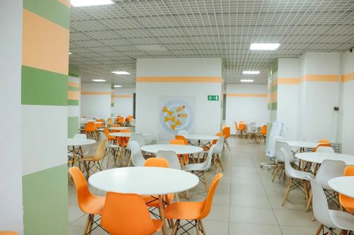 Сегодня ученики школы питаются в столовой, площадью 256 кв. м. Одновременно в ней могут завтракать или обедать 210 ребят. Помимо зала для приема пищи в составе столовой моечные для кухонной и столовой посуды, овощной и мясной цехи, складские помещения для хранения овощей, сахара и продуктов переработки зерна. Однако в рамках реализации проекта «Школьное кафе» предусмотрят и новые зоны.