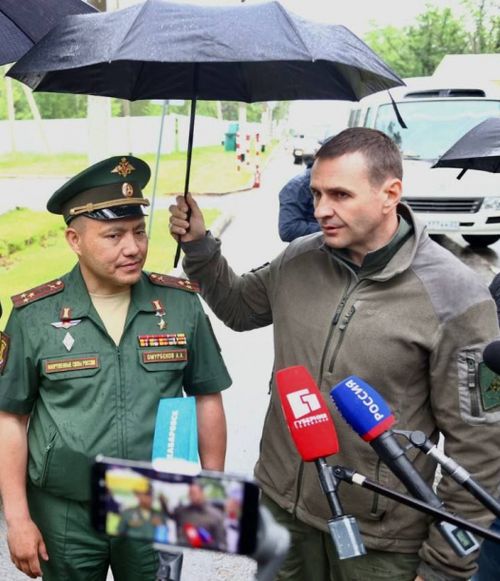 Во время осмотра территории шел сильный дождь, однако глава региона предпочел раскрыть зонт не над своей головой, а над идущим рядом Азатбеком Омурбековым.