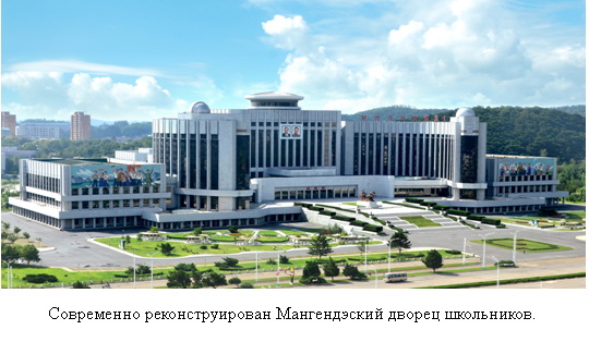 Один из членов Английской федерации тхэквондо, посетивший Мангендэский дворец школьников несколько лет назад, сказал: не верится, что построен такой великолепный и замечательный дворец для школьников. Этот дворец, где дети по своим вкусам и склонностям бесплатно учатся обширным знаниям разных областей, является единственным в мире дворцом детей.