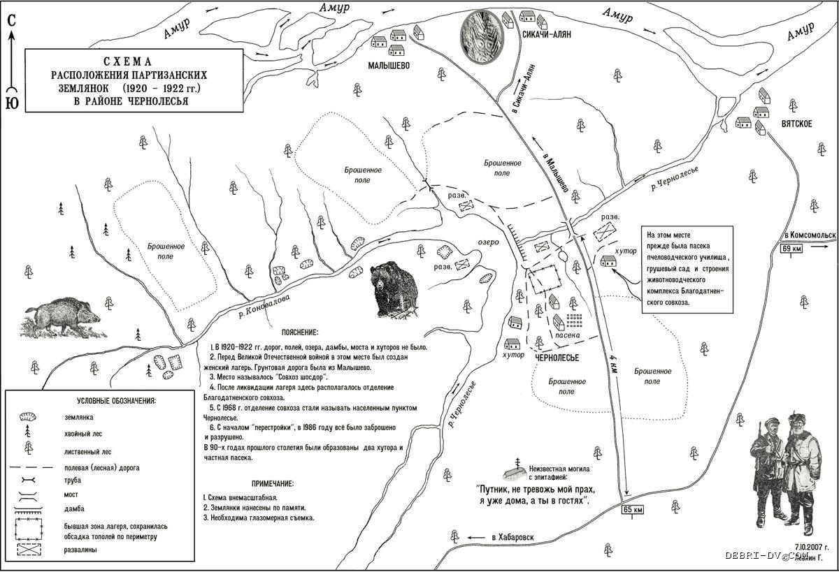 Дело в том, что вблизи от населенного пункта Чернолесье, представленного ныне практически тремя хуторами, отстоящими друг от друга более километра, в тайге до сих пор сохранились котлованы партизанских землянок периода гражданской войны и иностранной интервенции.