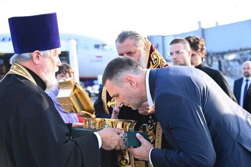 Глава региона Дмитрий Демешин и митрополит Хабаровский и Приамурский Артемий встретили святыню на площадке аэропорта. Владыка Артемий прочитал молитву и осенил ковчег крестным знамением. Губернатор края одним из первых приложился к святым мощам.