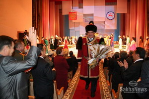В конце официальной части торжества Вячеслава Штырова в окружении представителей разных национальностей облачили в якутский национальный костюм, после чего он и члены президиума заняли места в зрительном зале – начался концерт по случаю вступления Вячеслава Штырова в должность Президента Республики Саха (Якутия).