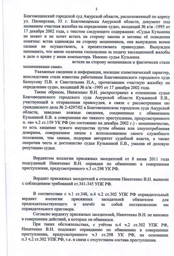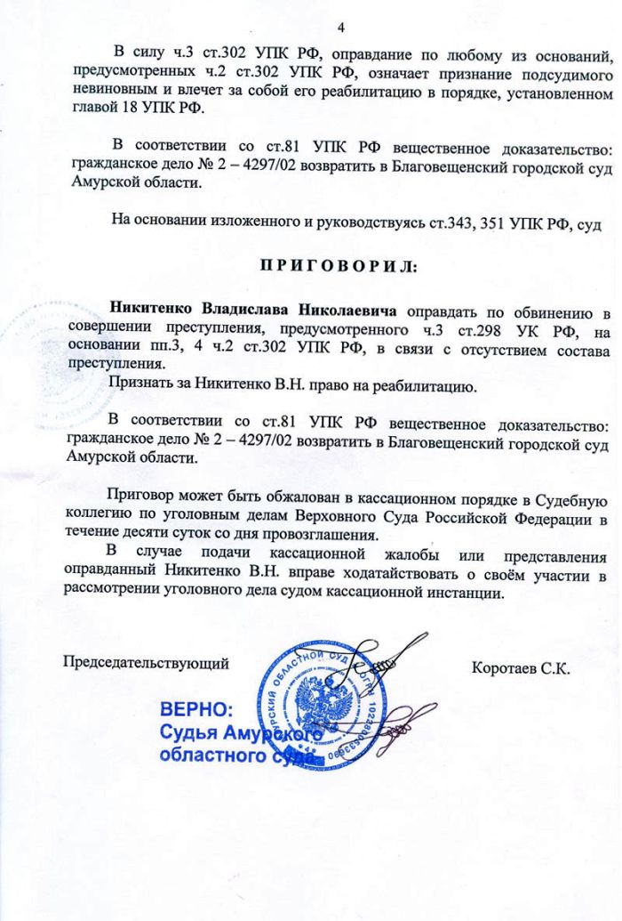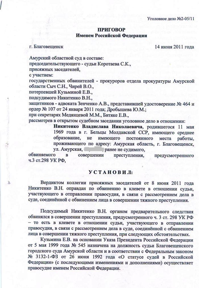 14 июня, на 3065 день с момента возбуждения дела, амурский журналист и путешественник Владислав Никитенко признан невиновным в клевете на заместителя председателя благовещенского городского суда. Это действительно уникальное дело. Оно было возбуждено по факту клеветы в отношении судьи по ч.1 ст. 298 УК РФ в январе 2003 года, закрыто за отсутствием состава преступления в июле того же года, вновь возбуждено по ч.2 ст. 297 УК РФ – (неуважение к суду) после того, как Владислав потребовал возбудить дело на своих преследователей за привлечение к уголовной ответственности заведомо невиновного. Его вновь прекратили в октябре 2004 года и оно тихо «дремало» до ноября 2007-го, когда его вновь возбудили уже после окончания срока давности, после того, как дважды оправданный потребовал извинений от прокуратуры.