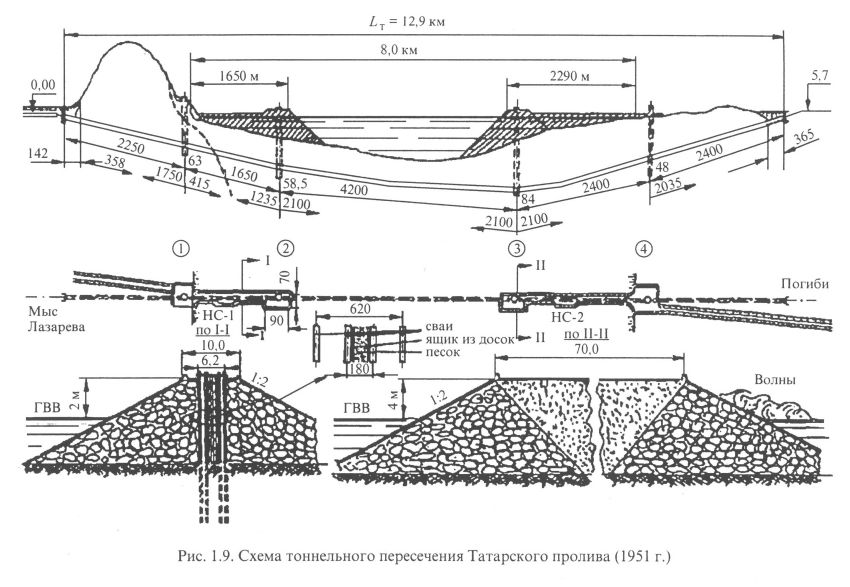 Основной же трудностью является то, что ширина пролива по трассе минимальной протяженности составляет 7,8 км, а глубина - 24 м. Все ранее построенные тоннели в неустойчивых грунтах имели длину не более 1,2 км (при щитовом способе) и 5,8 км (при способе опускных секций). Что же касается уже действующих подводных тоннелей большой протяженности (43 км под проливом Ла-Манш, 54 км под Цугарским проливом), то они едва ли могут быть приняты для сравнения, поскольку сооружались в устойчивых, крепких скальных грунтах обычными способами под нормальным давлением и без применения специальных методов, которые использовали только на небольших участках.
