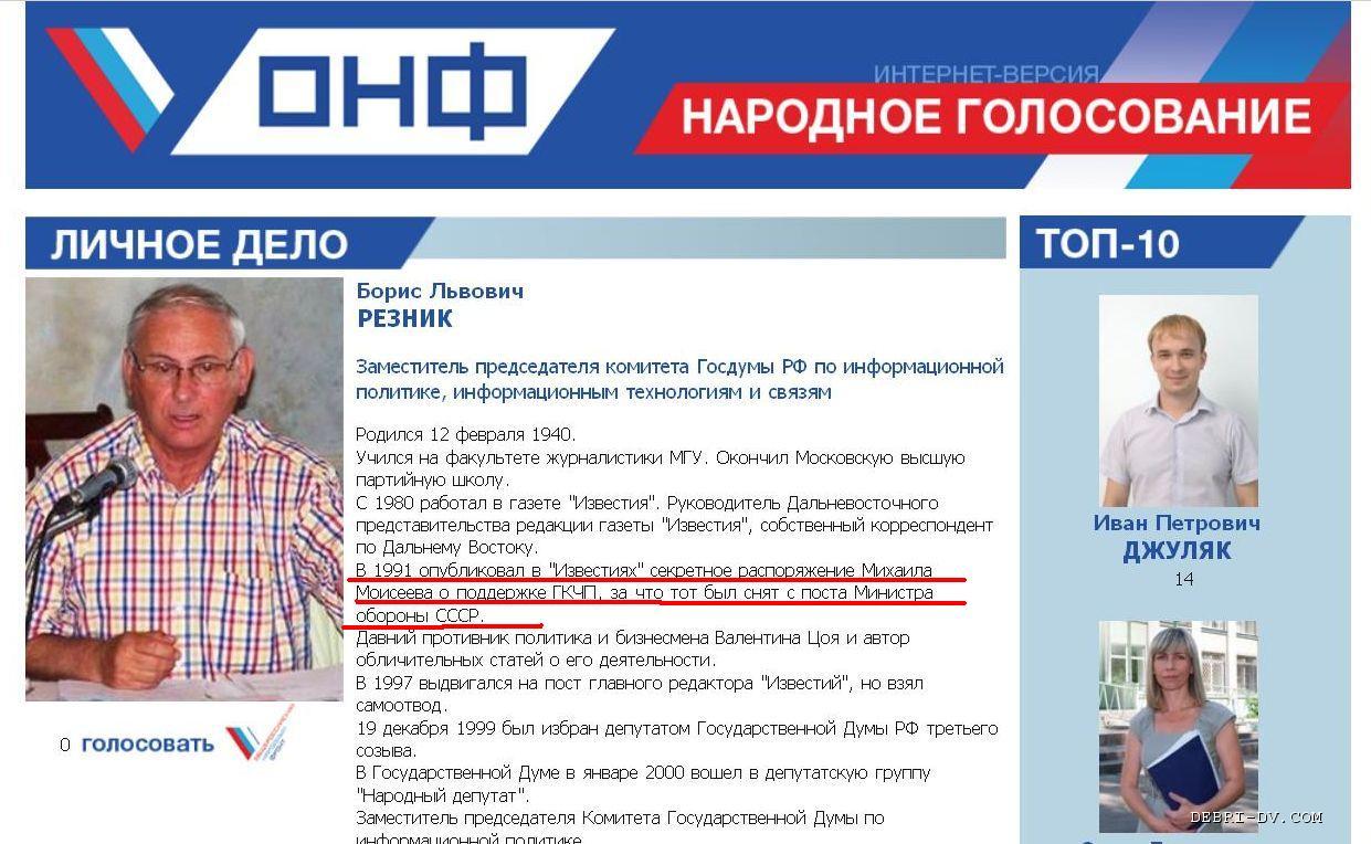 Этот факт, о снятии с должности генерала Моисеева, мы не нашли в биографии Бориса Резника на сайте , который тоже участвует в праймериз. Еще недавно сея информация была там отражена... У самого Михаила Моисеева, в биографии с 1990 до 1996 г. - ничего нет.