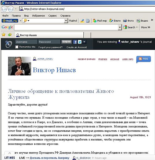 Постараюсь это делать и я. Хотя, судя по первым реакциям, кое-кто подозревает, что никакого Ишаева в Живом Журнале не существует. Так и Президента Медведева в том же подозревали. Скажу, что занятость моя весьма существенна, и на каждую реплику вряд ли отвечу, прошу заранее не вменять мне это в вину. Более того, пока все тексты в Живой Журнал от моего имени писали мои помощники – мы коротко о чем-то устно переговаривали, они излагали, как услышали. Это мой первый личный текст для Интернета. К биографии своей, которые разместили мои помощники, претензий не имею, она аутентична, хотя, может быть, и слишком официальна. Будет время – добавлю личного.