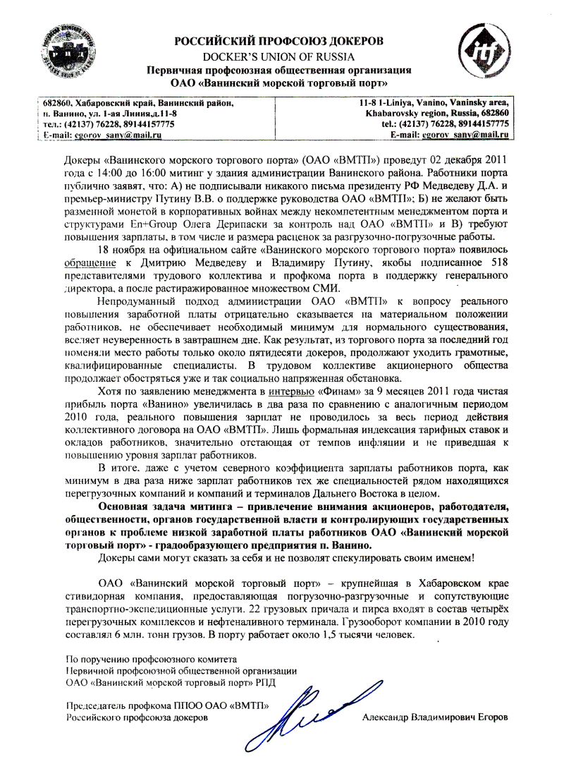 18 ноября на официальном сайте «Ванинского морского торгового порта» появилось обращение к Дмитрию Медведеву и Владимиру Путину, якобы подписанное 518 представителями трудового коллектива и профкома порта в поддержку генерального директора, а после растиражированное множеством СМИ.