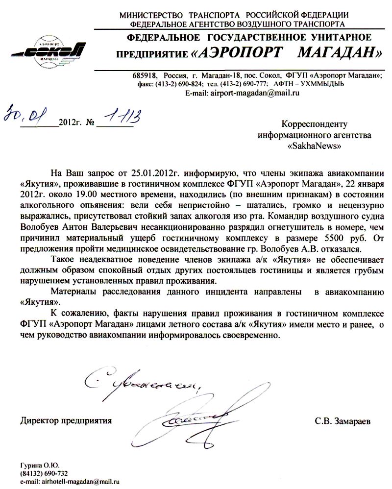 По его словам, члены экипажа авиакомпании «Якутия», проживавшие в гостиничном комплексе ФГУП «Аэропорт Магадан», 22 января около 19 часов находились (по внешним признакам) в состоянии алкогольного опьянения: вели себя непристойно – шатались, выражались нецензурной бранью, от них пахло перегаром. Командир воздушного судна несанкционированно разрядил огнетушитель в гостиничном номере, причинив материальный ущерб в размере 5 500 рублей. Все материалы направлены руководству якутской авиакомпании.