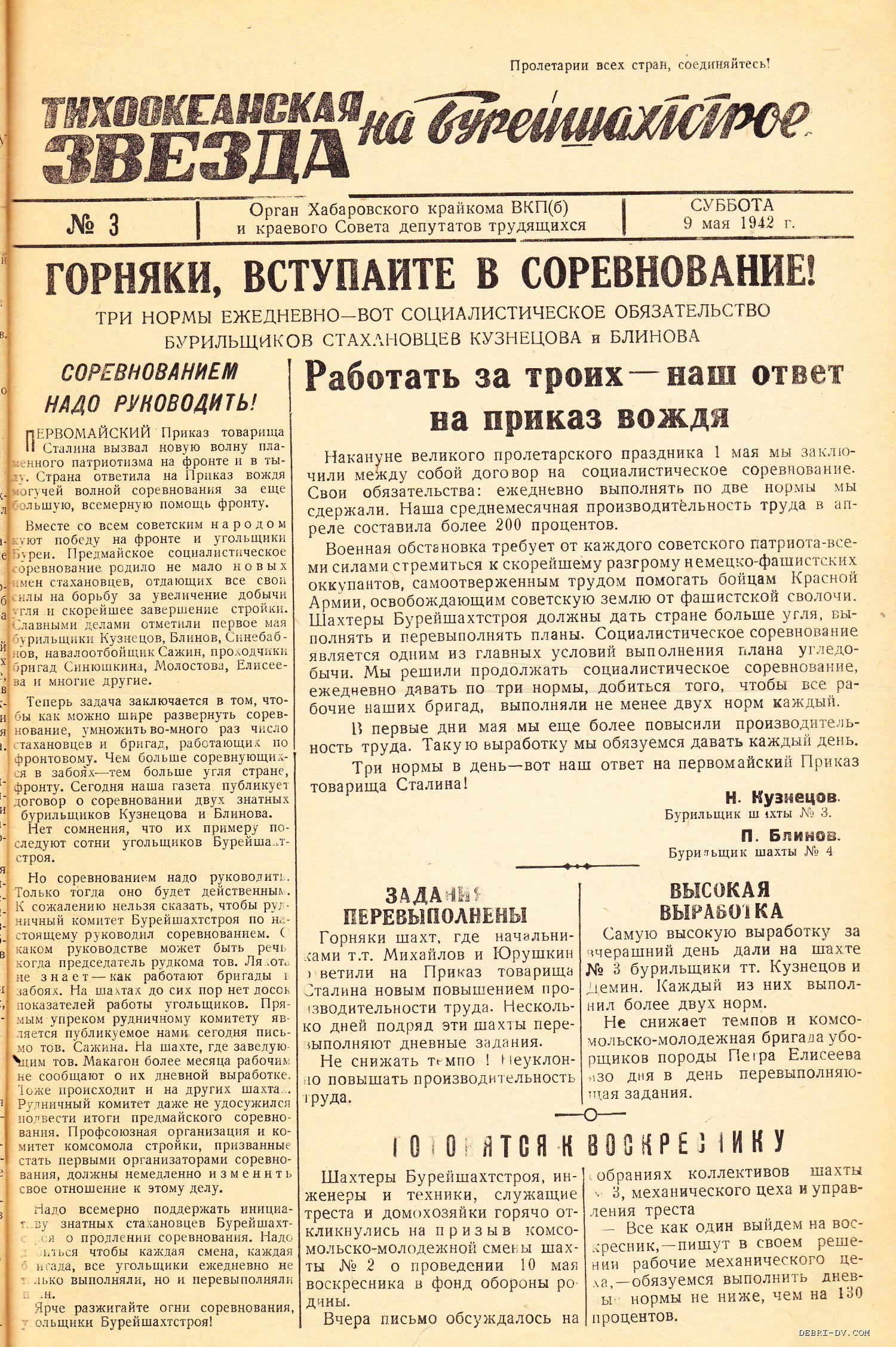 «Тихоокеанская звезда» на Бурейшахтстрое, №3, 09.05.1942 г./ Нажмите, чтобы УВЕЛИЧИТЬ стр.1 (нажмите, чтобы увеличить)