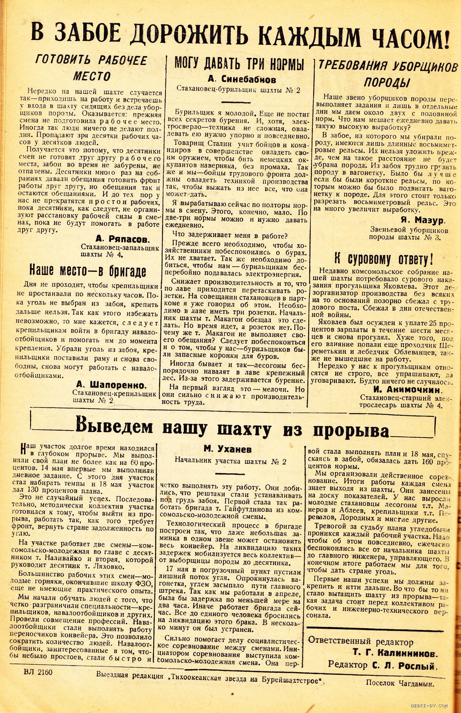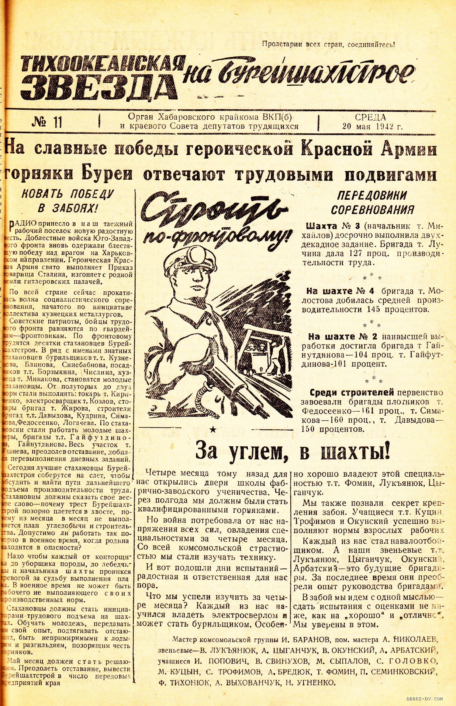 | «Тихоокеанская звезда» на Бурейшахтстрое, №11, 20.05.1942 г./ Нажмите, чтобы УВЕЛИЧИТЬ стр.1 |