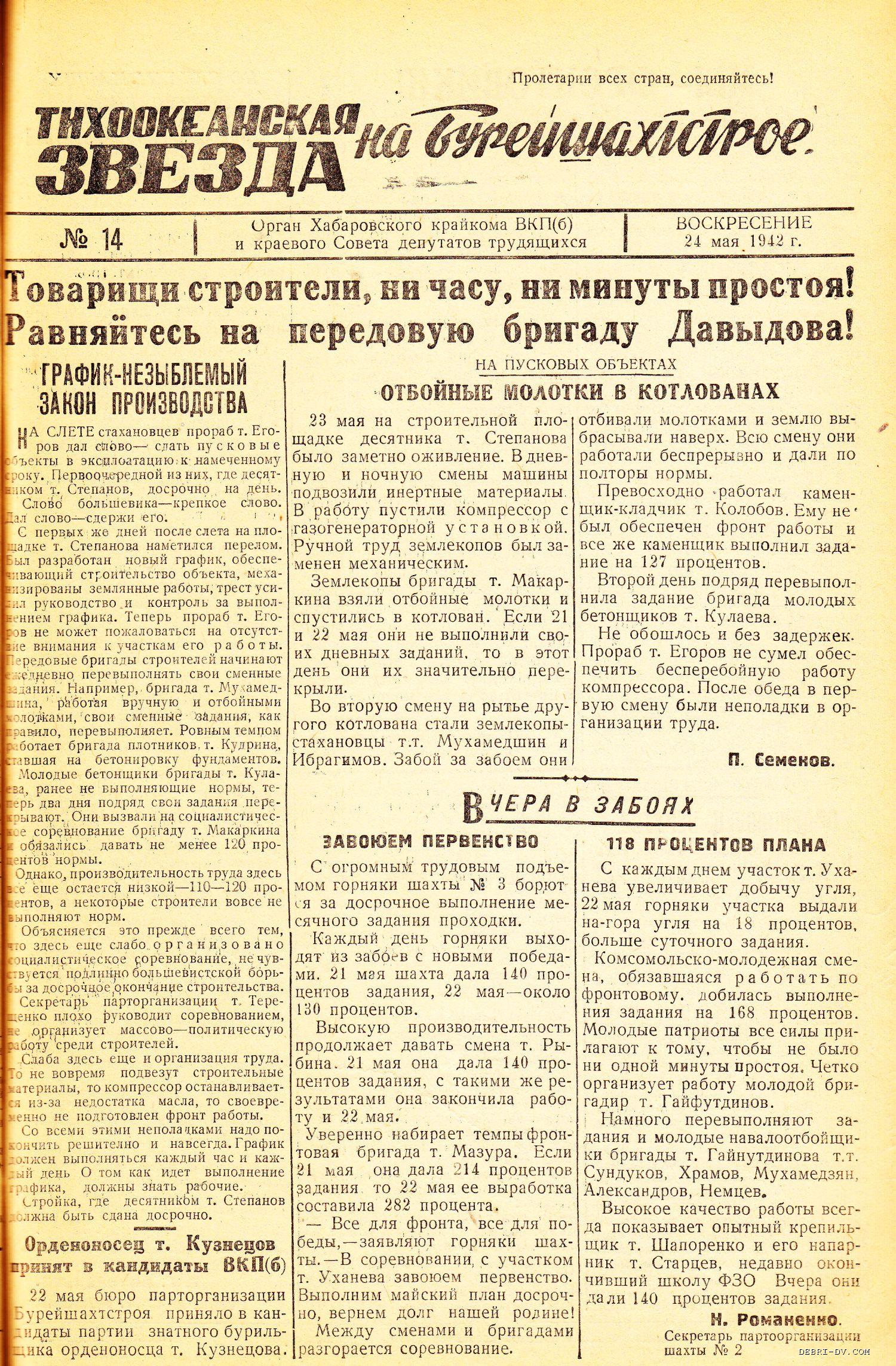 | «Тихоокеанская звезда» на Бурейшахтстрое, №14, 24.05.1942 г./ Нажмите, чтобы УВЕЛИЧИТЬ стр.1 |
