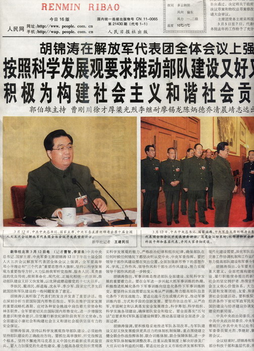 Генеральный секретарь ЦК КПК, председатель КНР, председатель Центрального военного совета Ху Цзиньтао 12 марта призвал вооруженные силы усилить военное обучение, чтобы предоставить сильную поддержку и обеспечить безопасность для всестороннего построения среднезажиточного общества и создания социалистического гармоничного общества.