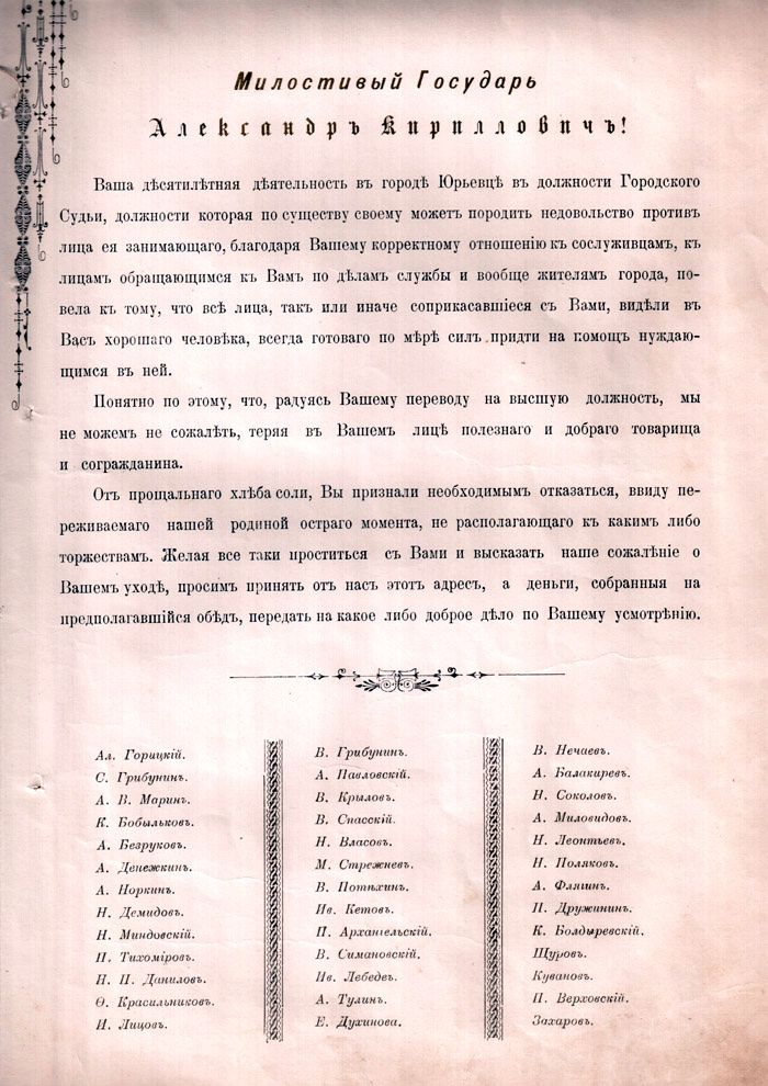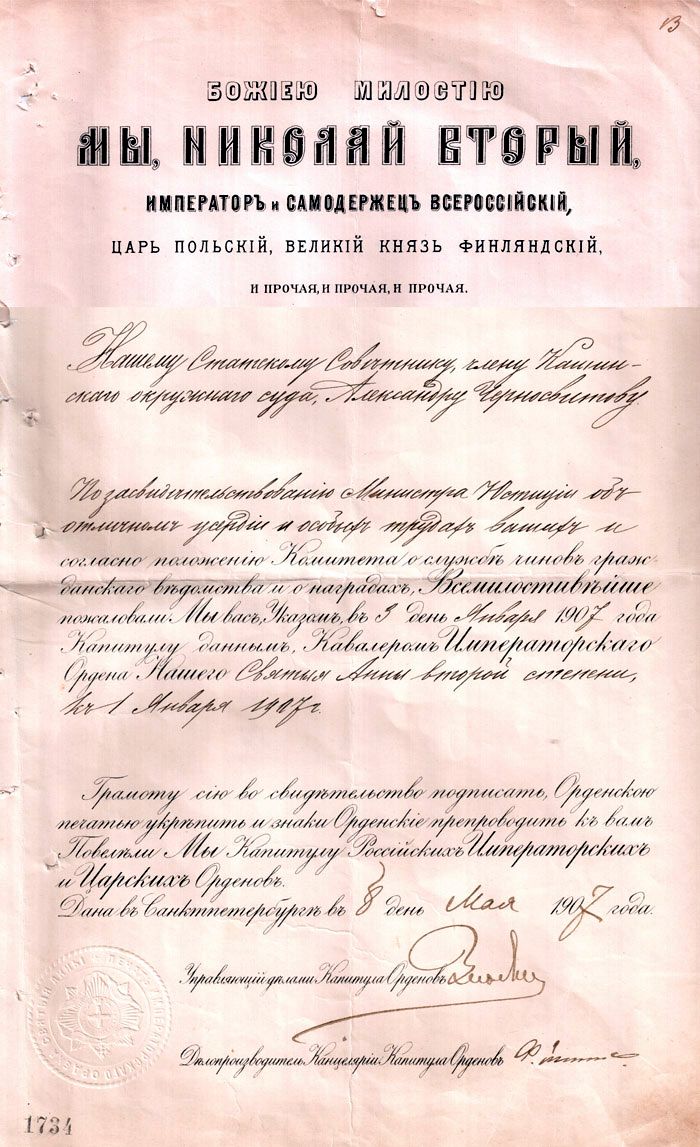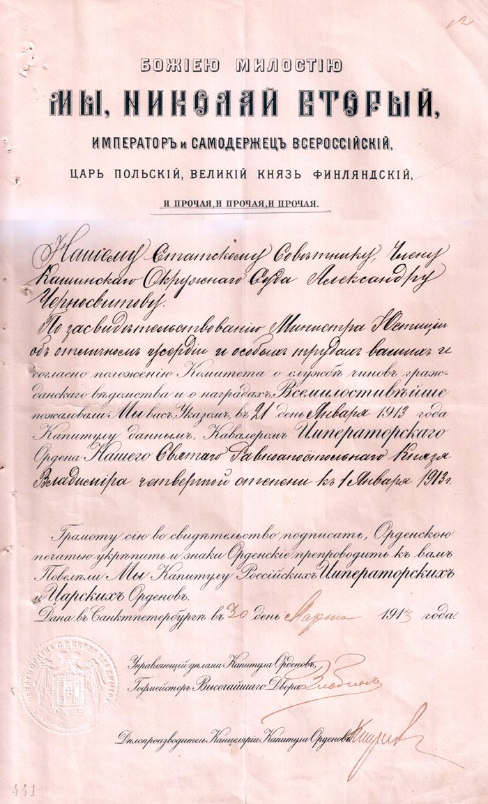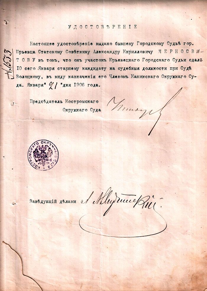 Посылаю Вам электронные копии документов, относящихся к члену Окружного суда г. Кашина Александру Кирилловичу Черносвитову. Надеюсь, что Вы сочтете возможным увековечить в своем городе память о человеке, так много сделавшем для г. Кашина!