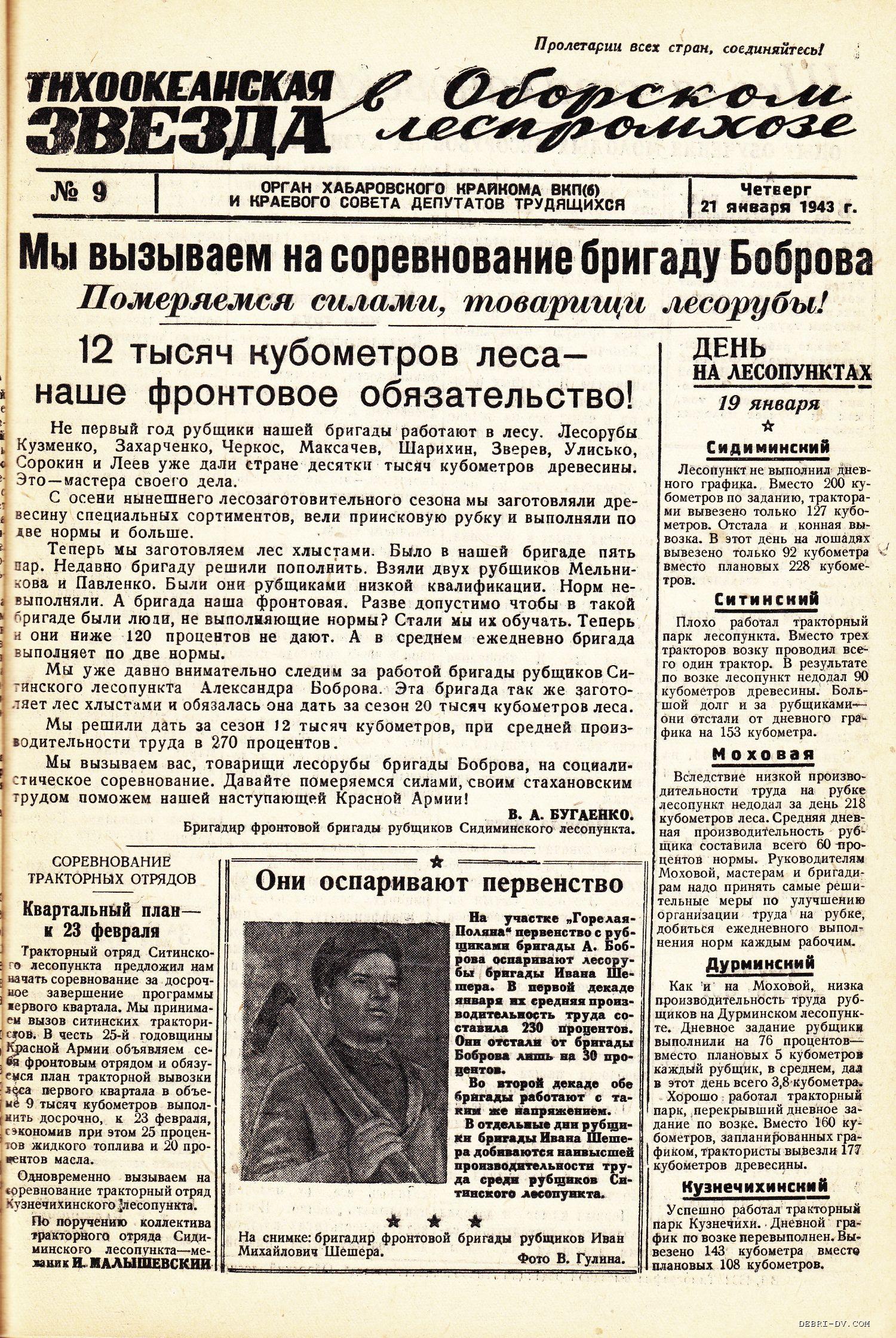 | «Тихоокеанская звезда» в Оборском леспромхозе, №9, 21.01.1943 г./ Нажмите, чтобы УВЕЛИЧИТЬ стр.1 |