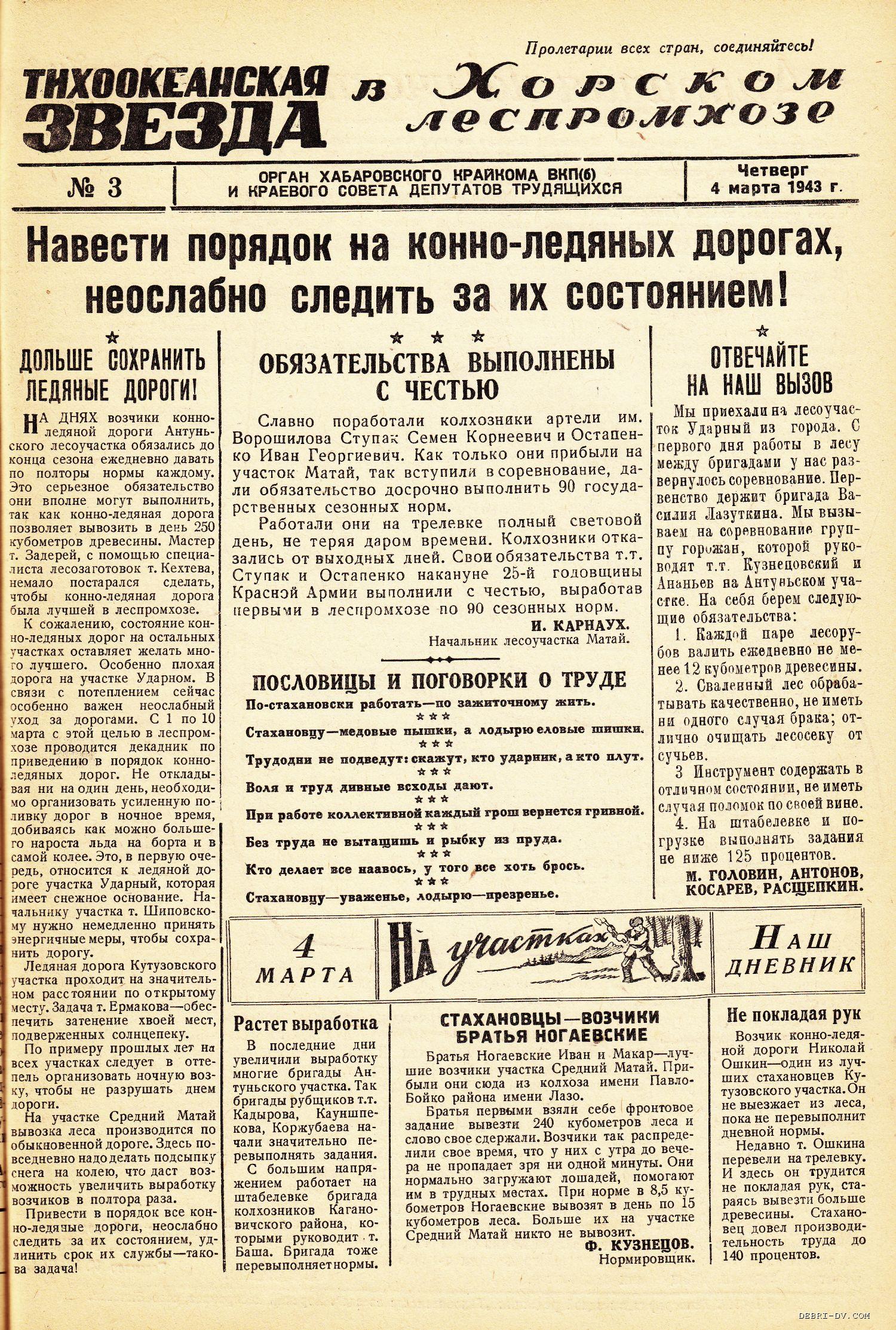 «Тихоокеанская звезда» в Хорском леспромхозе, №3, 04.03.1943 г./ Нажмите, чтобы УВЕЛИЧИТЬ стр.1 (нажмите, чтобы увеличить)