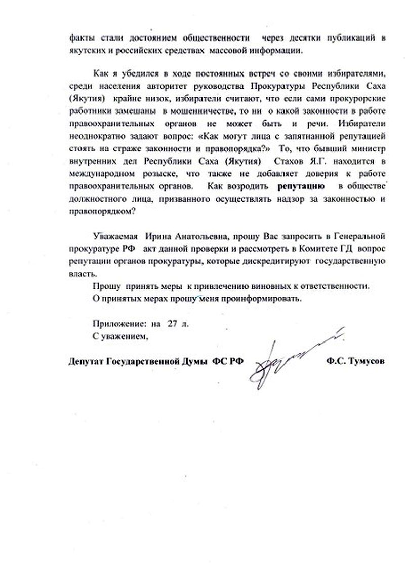 19 сентября с.г. депутат Госдумы Федот Тумусов направил по данному поводу депутатский запрос на имя председателя думского Комитета по безопасности и противодействию коррупции И.А.Яровой.