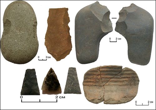 | Находки с острова Урильский: грузило, резчик, рубило, наконечники стрел, скребок (урильская культура) |