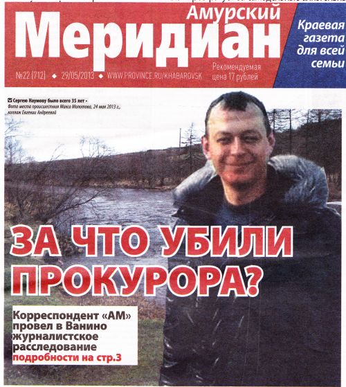 Первое сообщение об исчезновении исполняющего обязанности прокурора Ванинского района Сергея Наумова я обнаружил на сайте www.debri-dv.ru 21 мая 2013 г. По словам редактора портала Константина Пронякина, о происшествии ему стало известно днем раньше и он сутки безуспешно пытался получить официальный комментарий краевой прокуратуры по этому поводу.