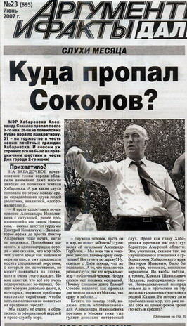Но самый модный слух: мэр снова подался в Москву. Но не на амурский пост метить, а «решать проблемы». А всему виной, по мнению слуховедов, - распространённый недавно московскими СМИ «чёрный список» мэров (см. Кто избавляется от слабого звена в вертикали власти?), якобы составленный администрацией президента и направленный генпрокурору Чайке «для принятия мер». В нём среди мэров ДФО Александр Соколов занимает почётное второе место. Возглавляет же список мэр Владивостока Владимир Николаев - который сейчас сами знаете где.