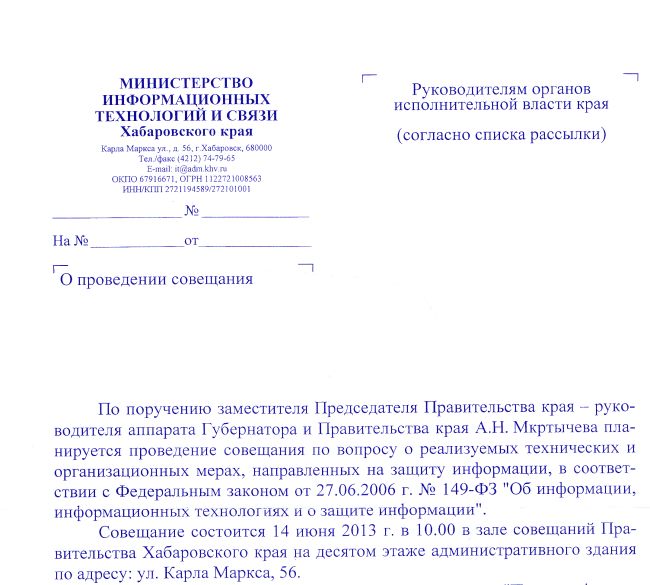 Здесь же указано, что министерство информационных технологий и связи Хабаровского края всех ответственных сотрудников обеспечивает зашифрованным каналом связи, защищенной электронной почтой (с гарантированной доставкой, а также автоматической фиксацией даты и времени получения, прочтения и отправки писем), обучение использованию технологии участников информационного обмена.