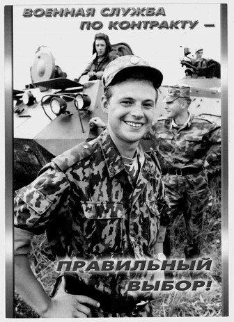 Михалев на плакатах агитирует к службе по контракту. При этом обещает различные привилегии. То есть обещает много хорошего, хотя сам этого не имеет. В рекламе, есть даже такая фраза: «Выбирая службу по контракту, ты выбираешь себе социальные гарантии».