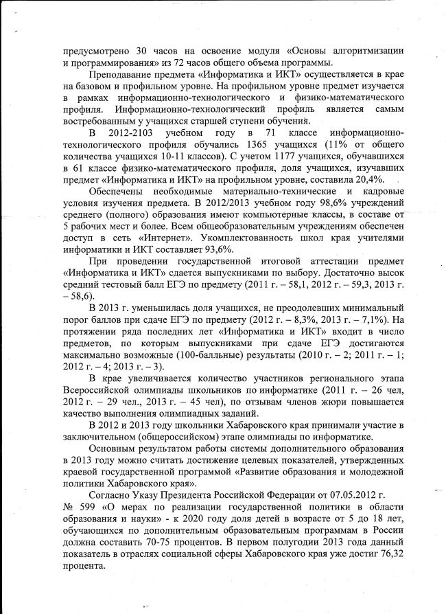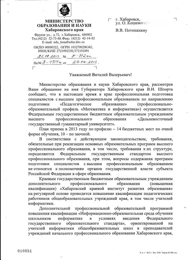 Еще цитата из министерского ответа: «В 2012 и 2013 годах школьники Хабаровского края принимали участие в заключительном (общероссийском этапе) олимпиады по информатике».