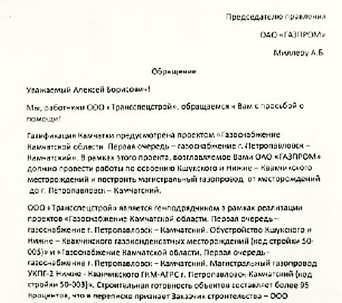 Председателю правления ОАО «Газпром» А. Миллеру Мы, работники ООО «Трансспецстрой», обращаемся к Вам с просьбой о помощи!