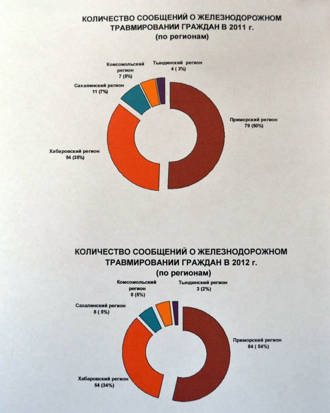 Фомин отметил, в большинстве случаев травмирования на железной дороге связаны с нахождением граждан на путях (следование по путям, переход путей), переходами под вагонами стоящего подвижного состава и несанкционированной посадкой на вагоны с последующим попаданием под колеса движущегося состава в результате неосторожных действий самих пострадавших. Наиболее часто случаи травмирования происходили на железнодорожных путях и остановочных пунктах в пределах крупных городов: Хабаровск, Владивосток, Уссурийск, Южно-Сахалинск, Биробиджан и других.