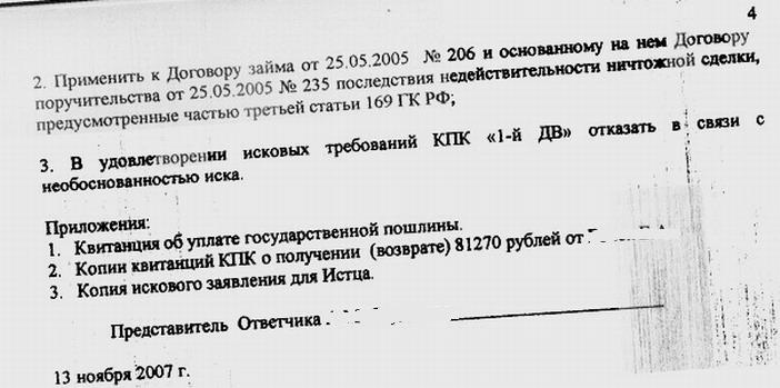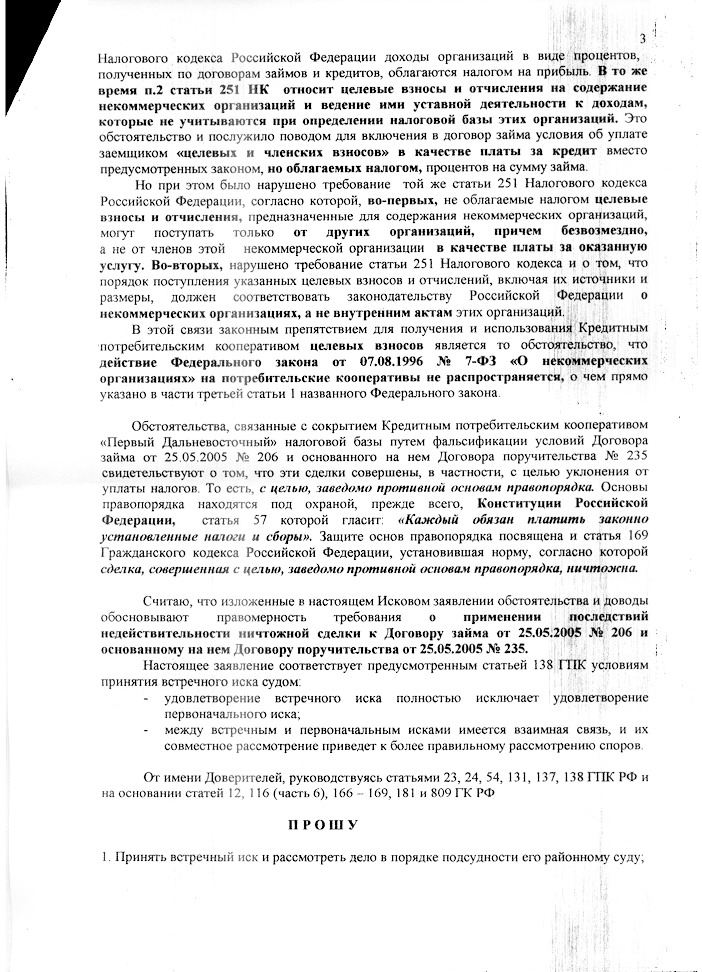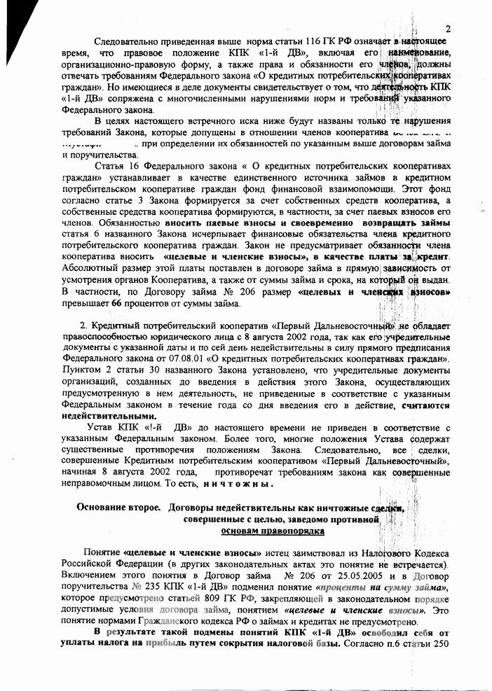 «Сделки, совершенные кредитным потребительским кооперативом «Первый Дальневосточный» начиная с 8 августа 2002 года противоречат требованиям закона…» (исковое заявление)