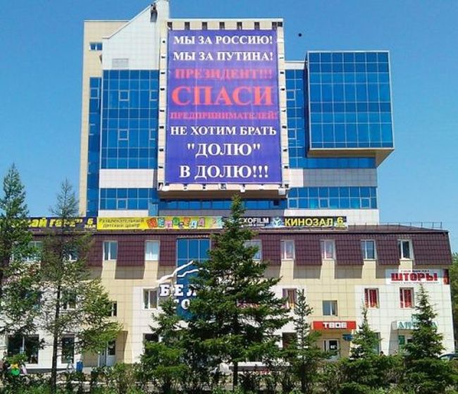 Ранее, предприниматели Уссурийска просили Путина о спасении. Рядом со зданием администрации города на фасаде торгового центра «Белая гора» в прошлом году был установлен огромный баннер. На плакате большими буквами написано: «Мы за Россию! Мы за Путина! Президент, спаси предпринимателей! Не хотим брать «Долю» в долю!!!» Как сообщают «Арсеньевские вести», «Долей» уссурийские предприниматели называли мэра города - С.П. Рудицу.