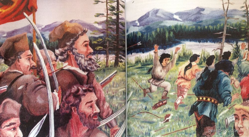 | Первопроходец Иван Москвитин с казаками прогоняет эвенов. Рис. А. Овчинникова./ Нажмите, чтобы УВЕЛИЧИТЬ |