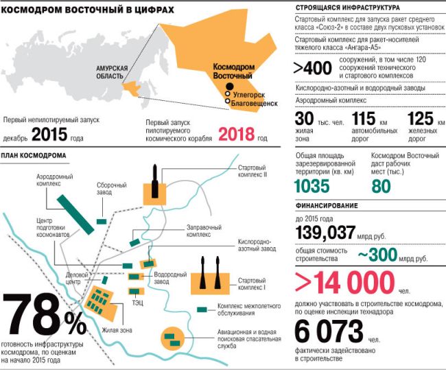 Первый непилотируемый пуск был назначен на 2015 год, пилотируемый - в 2018-м (см. справку). Было определено точное место строительства Восточного (вблизи поселка Углегорск Амурской области), зарезервирована площадь под возведение его объектов (более 1000 кв. км). В 2011 году началось техническое и эскизное проектирование, а в 2012-м - стройка.